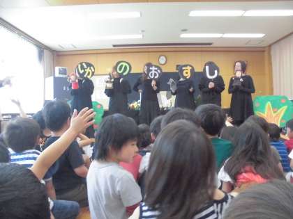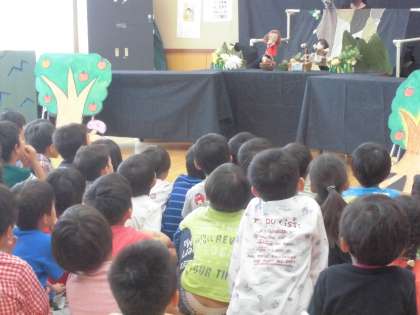 赤ずきんちゃんの人形劇を聞き,自分の身を守る合言葉「いかのおすし」を教わりました。登下校時にも安全に気を付けられるようになってほしいと思います。
