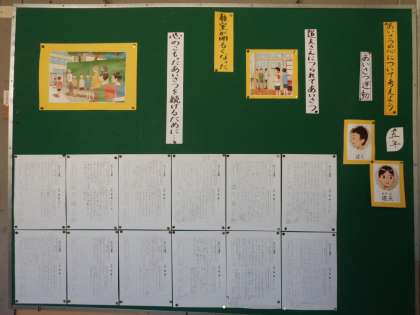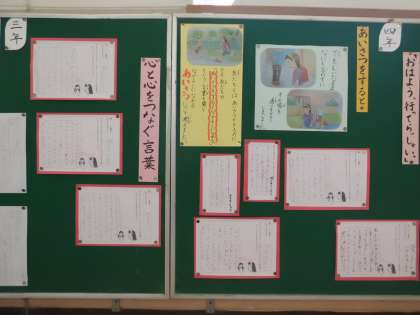 心の広場学習の掲示板が新しくなりました。 4月のあいさつの学習について,各学年の掲示がされています。