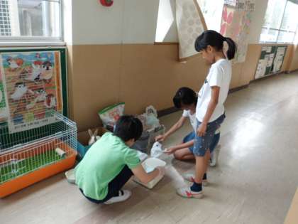 職員室前に,ウサギがいます。 飼育委員会の子どもたちが,毎日世話をしています。
