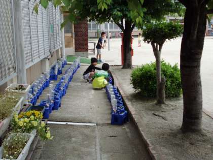 一年生が,朝顔の水やりをしています。