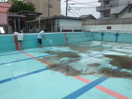 午前中に,教職員でプール清掃を行いました。