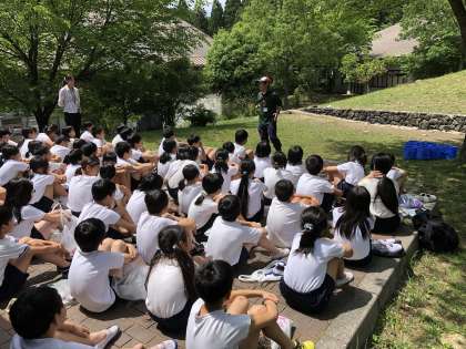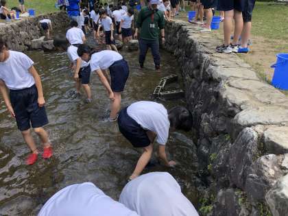 今から「魚つかみ」を行います。まずは,職員さんの説明を聞きます。その後,グループに分かれイワナを手で捕まえます。動きが素早く,なかなか捕まえられず,苦戦しているようです。