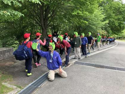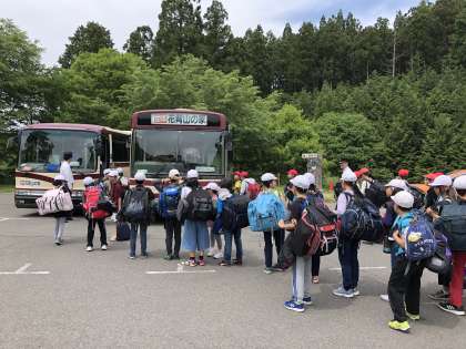 退所式が終わり,いよいよバスに乗って帰ります。この4日間の思い出を胸に,帰路へと向かいます。お世話になった職員さんとハイタッチ!山の家,ありがとう!