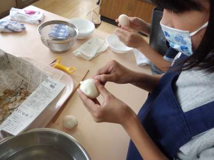 今日は調理実習の第二弾「ゆでる調理をしよう」で「ゆで卵」「ゆでいも」に挑戦しました。