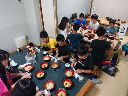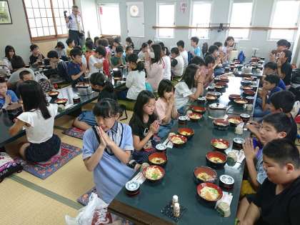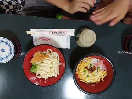 こんぴらさん参拝,最後の買い物を終え,中野うどん学校に戻ってきました。うどんとちらし寿司をいただきます。