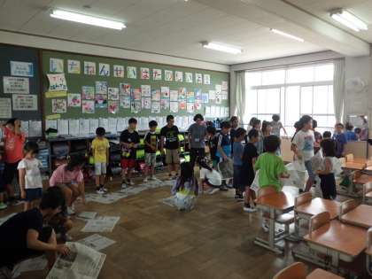 新聞紙をつかって,グループでじゃんけんをしました。高学年の児童が,やさしく他の学年の児童に関わっている姿が素敵でした。