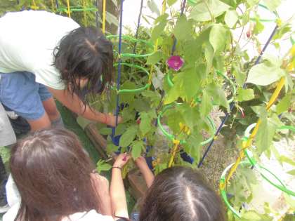 今日はあちこちに巻き付いたつるを綺麗に整えたり,暑さで枯れてしまった葉っぱをとったりしてお世話をしました。