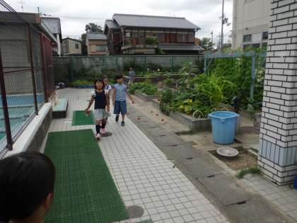 さっさく用務員さんと一緒にネットをかけに行きました。