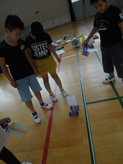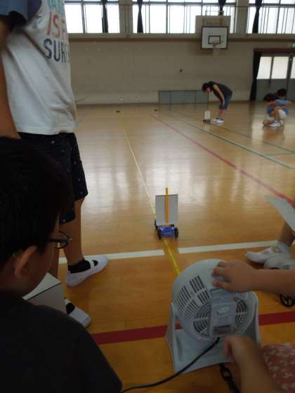 0716 3年生 風の力でものをうごかそう 公開日 2019/07/16 更新日 2019/07/16 3年生 先日のゴムに続き,今日は風の力を使って車を走らせました。 ゴムと違って勢いはありませんが,風が届く限りいつまでも走り続ける車に一喜一憂。 今日も楽しみながら学習することができました。