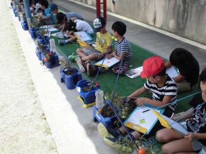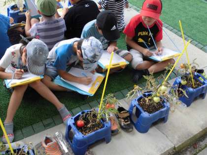 夏休み前のミニトマトの観察を行いました。実が赤くなっているものが多く,子どもたちは以前との違いに気づきながら観察することができました。