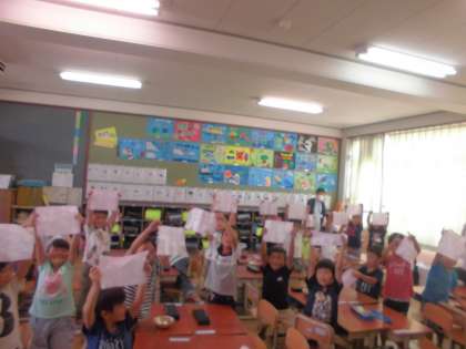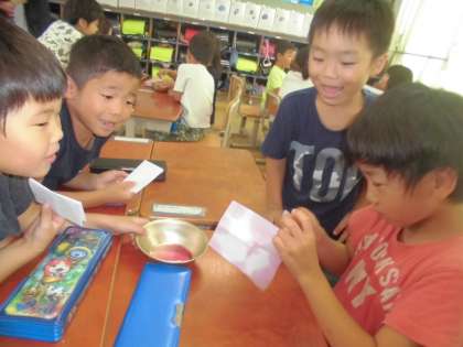 朝顔の花びらと少量の水を使って色水を作り,和紙を染めました。 わいわいと楽しみながら活動することができました◎