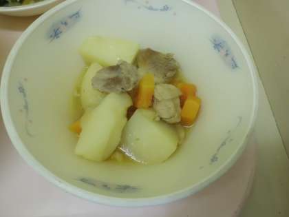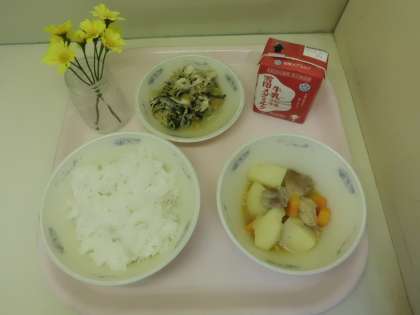 じゃがいもを使った献立の日は,調理員さんの長年の経験からの工夫をして調理しています。見た目は形が残っているのに,食べるとホクホクしていてとても美味しく仕上がりました。副菜のもやしはシャキシャキした歯ごたえを楽しみました。
