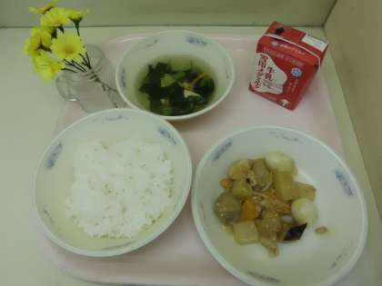 今日の献立は,ごはん・牛乳・プリプリ中華いため・とうふと青菜のスープでした。