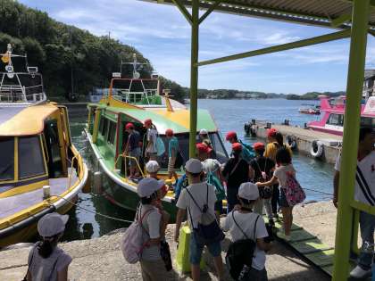 みさきの家1日目 賢島港に到着 公開日 2019/09/09 更新日 2019/09/09 4年生 賢島の港にバスが到着しました。今から船に乗ってみさきの家の『なかよし港』に向かいます。天気がいいので,気持ち良さそうです。