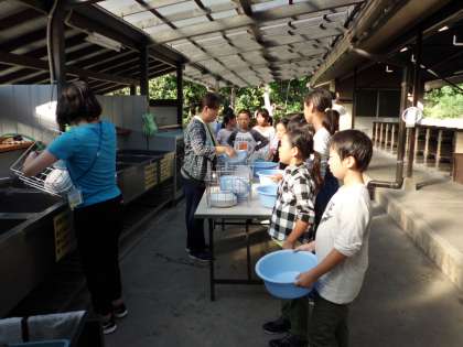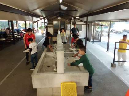 みさきの家 2日目 野外炊事 その2 公開日 2019/09/10 更新日 2019/09/10 4年生 包丁やまな板を洗う係,皿やスプーンを熱湯消毒する係に分かれています。 順調に作業が進んでいます。