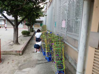 朝休みの様子です。アサガオの水やりをしています。まだまだ花もきれいに咲いています。