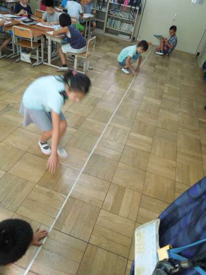 算数科の単元「時間と長さ」の学習で,実際に巻き尺やストップウォッチを使い,身近なものをはかりました。