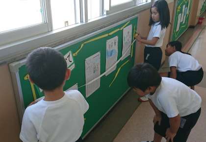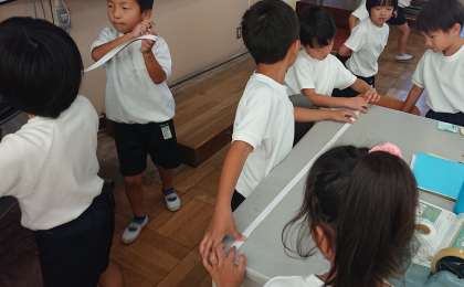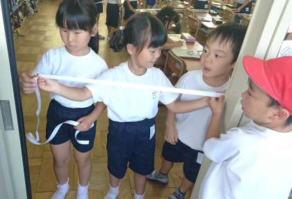 算数では大きさや長さをくらべる学習をしています。昨日は紙テープを使っていろいろなものの長さをくらべる活動をしました。