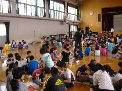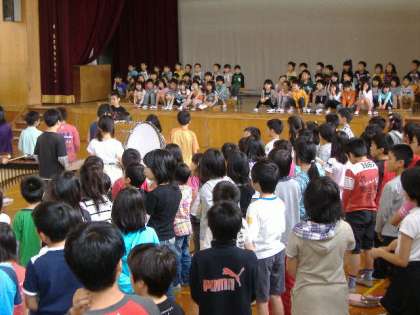 児童会主催の「1年生を迎える会」が体育館で行われました。スローガンは,「ようこそ1年生 明るく笑顔あふれる明親小学校へ」です。1年生入場のあと,音楽委員会の伴奏に合わせてみんなで校歌を歌ったり,たてわりグループの“なかよし”顔合わせをしたりしました。運動会でも「なかよし種目」があります。これから1年間,みんなで楽しく活動していってほしいと思います。