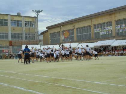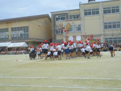 なかよし種目の2つ目,おじゃま玉入れが始まりました。1〜6年生のみんなでより多くの玉を入れますが,その前には大きな手が…。それでも協力し合って頑張ります。