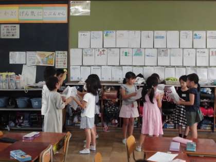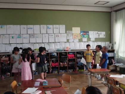 明日の町探検へ向けて,今日はリハーサルを行いました。「おはようございます」「明親小学校の2年生です。町探検で来ました」「ありがとうございました」など,本番と同じ形式でインタビューの練習をしました。