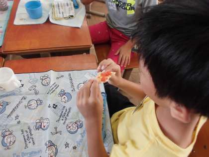 4日(金)に,以前収穫したミニトマトを煮詰めて作ったトマトソースを食べました。クラッカーにのせて食べると「おいしい!」「食べやすいなあ!」と大喜びでした。