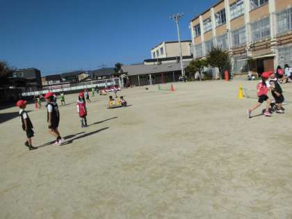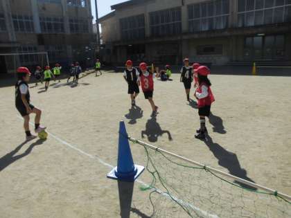 体育のボールけりあそびの運動でゲームを楽しんでいます。「パス!」「シュート!」とゴールまで動きを工夫しています。たくさんシュートが入るようになりました。