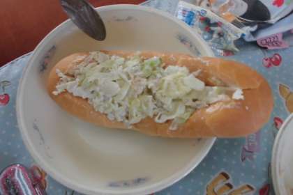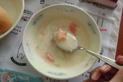 教室で,自分の適した分量のマヨネーズを混ぜ合わせ,パンにはさんで美味しくいただきました。チャウダーには,星形の人参がたくさん入っていました。