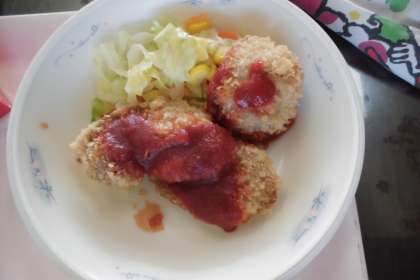 一枚一枚丁寧に,給食室でパン粉をつけて,こんがりきつね色に油で揚げていきました。手作りのソースとよく合っていました。