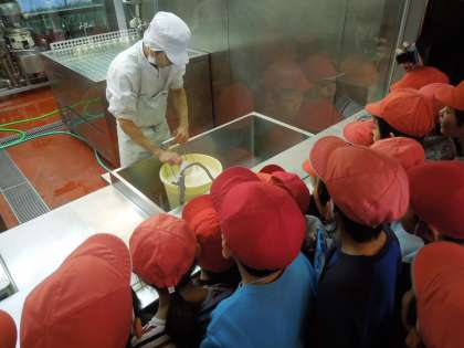 前半は,とうふ作りの現場を見学。