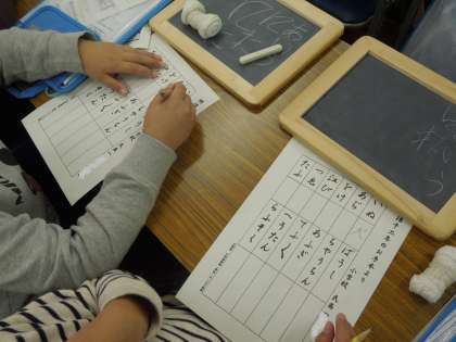 明親小学校も歴史ある学校なので,みんな昔の小学生と同じ体験に興味深く取り組んでいました。