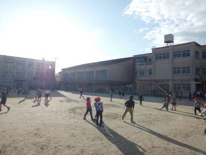 太陽の日差しを受け,校庭で元気に身体を動かしています。