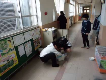 職員室前では,飼育委員会の子どもたちがウサギの世話をしていました。