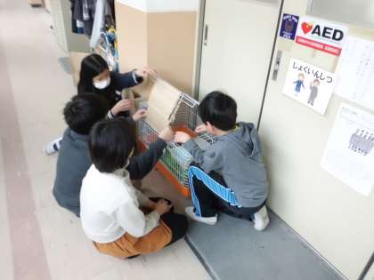 数名の子どもたちが,職員室前のウサギに会いに来ています。