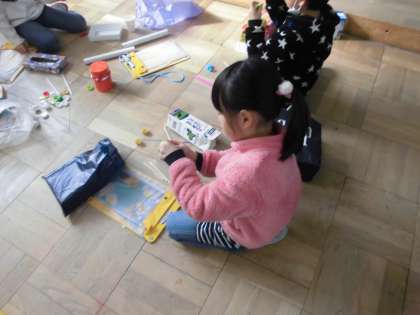 「う〜ん・・・うまくいかないなあ」「よし,走ったぞ!」「こうしたら・・・あかんなあ」「できた!ここにつければいいんやなあ」と,子どもたちは様々なことを試しながらおもちゃ作りに取り組んでいます。
