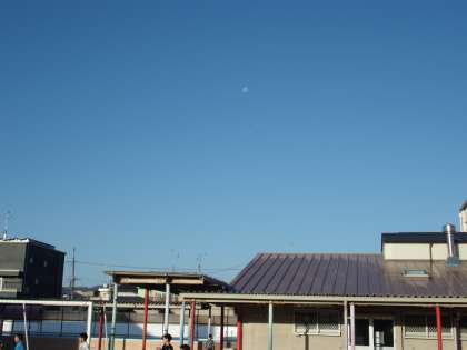 校庭西側のプールの上を見上げると,きれいな月が見えました。