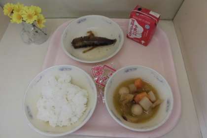 今日の献立は,ごはん・牛乳・いわしのしょうが煮・関東煮・いり豆でした。