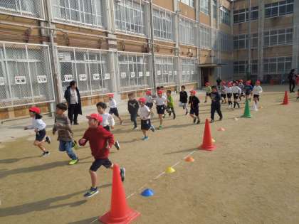 前半は低学年が5分間,後半は高学年が5分間走ります。