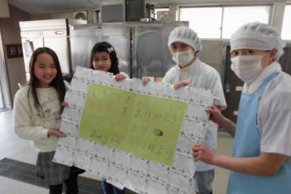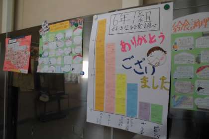 給食委員会の児童が,全校児童に食べ物アンケートをとりました。その結果をもとに,好き嫌いをなくそうという児童が考えたシナリオの劇をビデオに撮りました。各教室でそのビデオを見て,好き嫌いについて考えることができました。また,給食調理員さんへ感謝の気持ちを伝えるメッセージを作り,渡しました。給食室のサービスホールには,素敵なメッセージがいっぱいです。