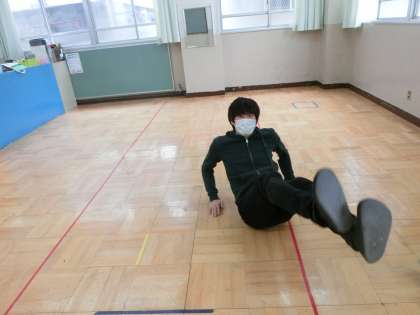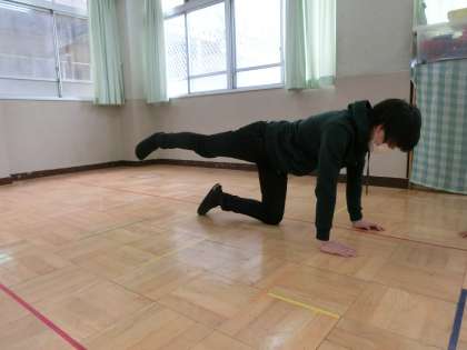 若草学級では,毎日朝の会の時に体操をしています。手は後ろ,足を上げて10回クロスさせたり10回自転車こぎをしたり。次に,両手両足を床について,10数える間片手を上げる,片足を上げる,片手と片足を上げる。