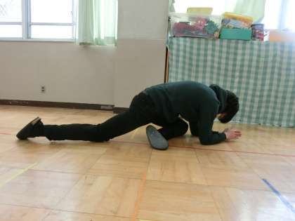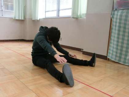 足を開いて手で足先をさわる。うつ伏せで片足は曲げ,もう片方の足を伸ばす。