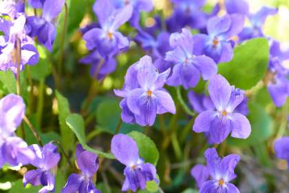 むらさき色のしょくぶつは,「すみれ」です。すみれにはたくさんしゅるいがあってほかにも白,ピンク,黄色などのいろもあるんですよ。