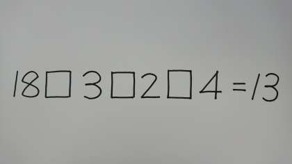 下の写真の□の中に,+,−,×,÷のどれかを入れて式を完成させましょう。