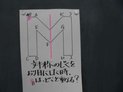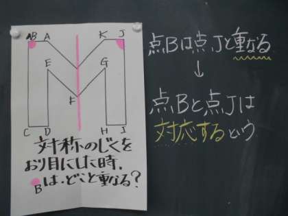 (1枚目の写真)線対称の図形で,対称の軸を折り目にした時,点B はどこと重なるでしょうか。写真ではピンクのついている点ですね。では,実際にやってみましょう。