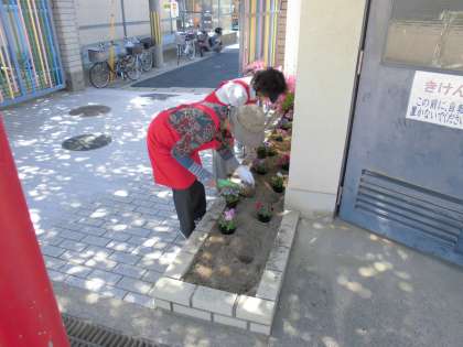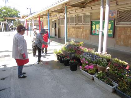 今日は女性会のみなさんが来て下さり,正門の花の植え替えをしてくださいました。少し暑いくらいのいい天気でしたが,していただいたおかげで,正門の周りが華やかになりました。植え替えていただいた花が,まるで児童の登校を出迎えてくれているようです。