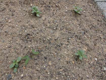 さて,下の写真は畑を上からとったものなのですが,よ〜く見ると植えた覚えのない花も芽を出しています!どこにあるか分かりますか。