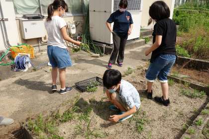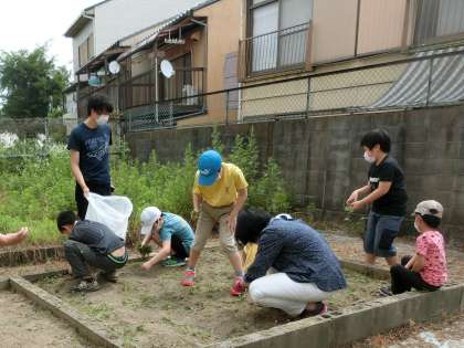 休校期間中に,まずは,先生たちで畑の周りの草を抜きました。今週に入り,登校グループごとに,畑の中の草抜きをしました。