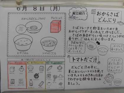 6月8日(月)の給食は,ごはん・牛乳・おからさば丼(具)・トマトだご汁でした。
