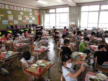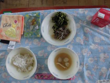 6月22日(月)の献立は,麦ごはん・牛乳・牛丼(具)・だいこん葉のいためもの・いものこ汁でした。一年生にとっては毎日が「はじめて」のメニューになります。今日は,はじめて給食当番をする人がいて,中には,はじめてづくしの人もいます。はじめてすることには頑張る勇気や,やり抜く強い気持ちが必要です。一年生の心の中で一人一人が自分のめあてをもって取り組めていました。給食エプロンを初めてたたむ人,給食を頑張って食べている人,ご飯粒を頑張ってよせている人,給食時間はみんなの頑張りがつまった時間だな〜と思いました。明日も元気にみんなで給食をいただきましょうね!