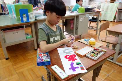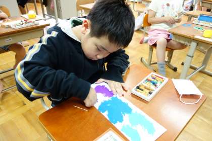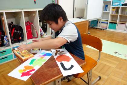 次に,言葉の1文字1文字ていねいに色ぬりをしました。もうすぐ完成です。